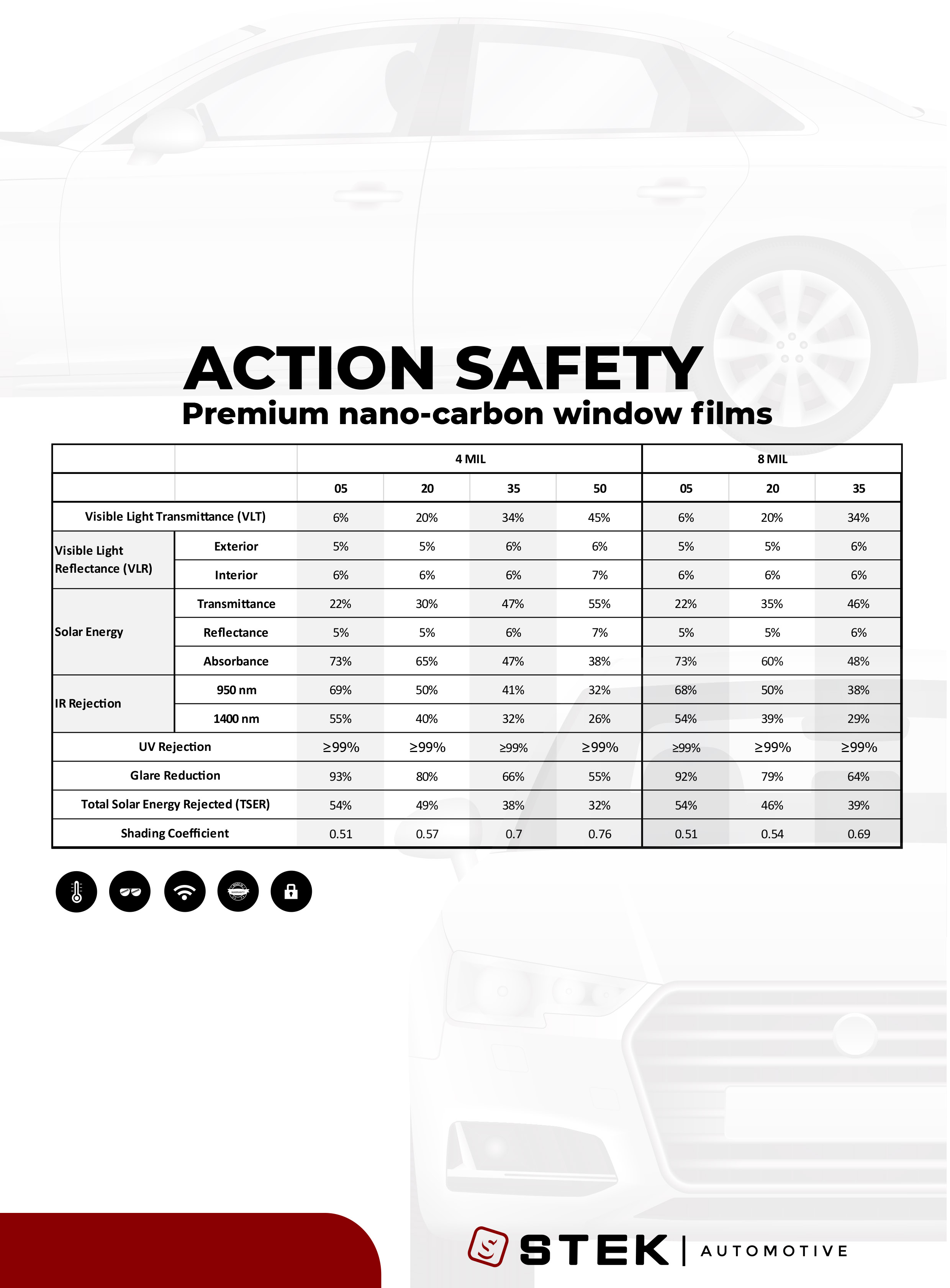 STEK ACTIONseries window tint film is a Nano Carbon tint that provides a stylish look, heat rejection and 99% UV protection. Its quality materials offer superior performance and outstanding color stability. STEK stands behind ACTIONseries window tint with a limited lifetime warranty against fading and peeling as well