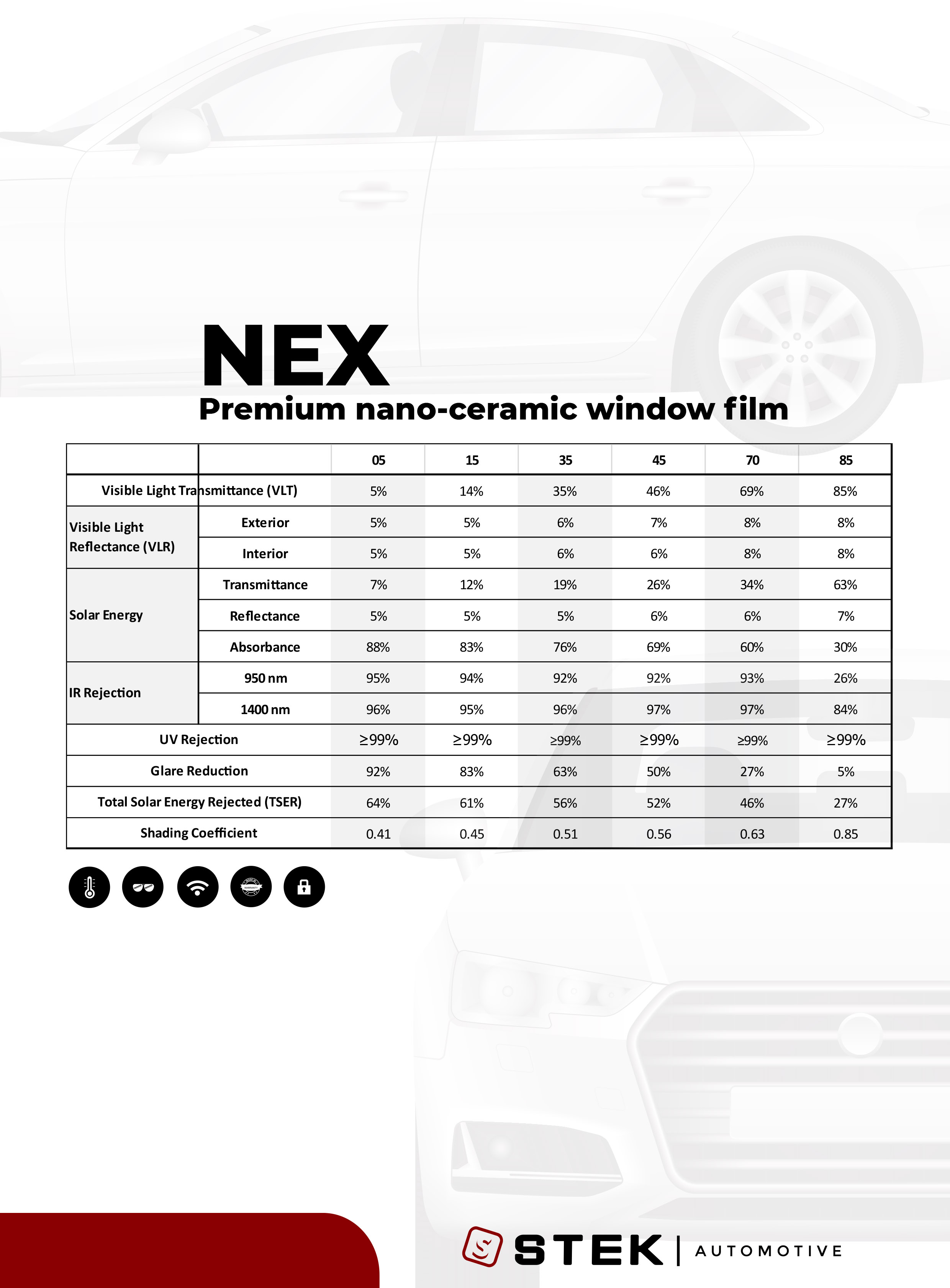 ฟิล์มกรองแสง STEK รุ่น NEX ซีรีส์ คือนวัตกรรมใหม่ล่าสุดของ STEK ที่ได้พัฒนาจากเซรามิก มาเป็นพรีเมี่ยมเซรามิก ที่เพิ่มขีดความสามารถด้านการกันความร้อนที่เพิ่มมากขึ้น และที่สำคัญยังเพิ่มความสามารถที่ทนทานต่อสภาพอากาศที่โหดร้ายได้ดี สีไม่ซีดจางง่ายๆตลอดอายุการใช้งาน ป้องกันอินฟราเรดได้มากกว่า 98% และกัน UV ได้มากกว่า 99% ด้วยความสามารถด้านการวิจัยและพัฒนาสินค้า STEK ได้นำกราฟีนมาผสมเข้ากับเซรามิก ทำให้ได้เป็นสุดยอดสินค้านวัตกรรมใหม่ของโลก ปกป้องภายในรถจากแสงอาทิตย์ที่ดีเยี่ยม คุ้มค่าคุ้มราคากับนวัตกรรมฟิล์มกรองแสงแห่งอนาคตจาก STEK